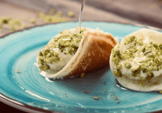 2 Crêpes farcies à la mascarpone et crème, pistache sirop fleur d’oranger